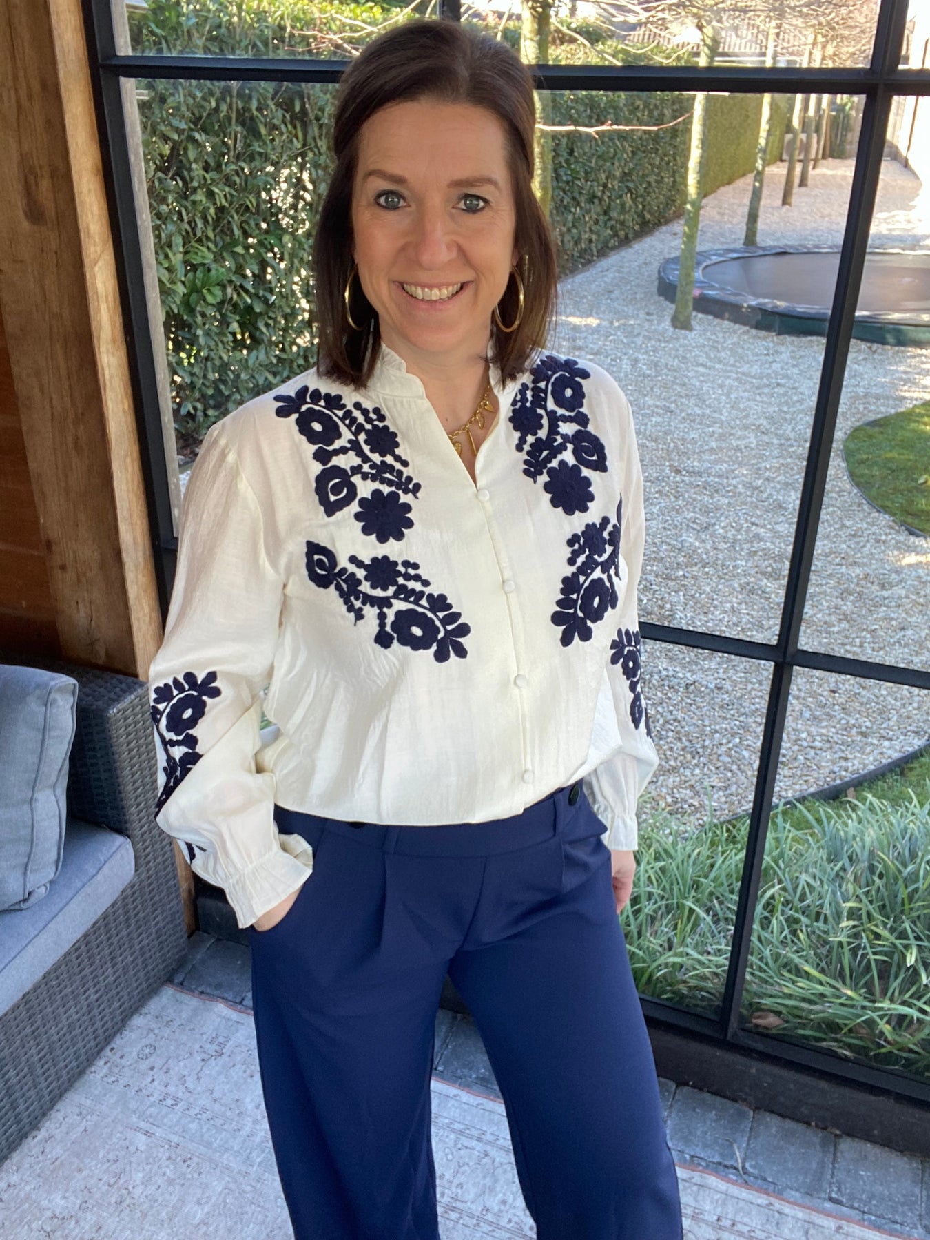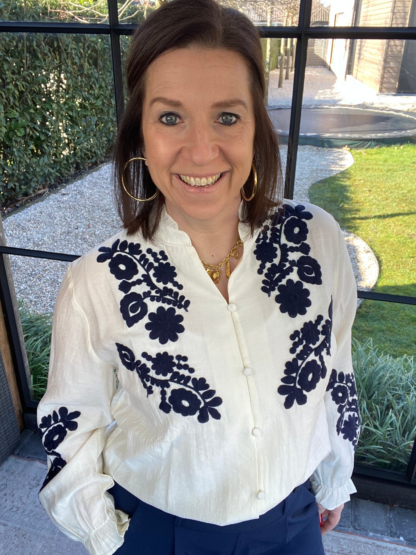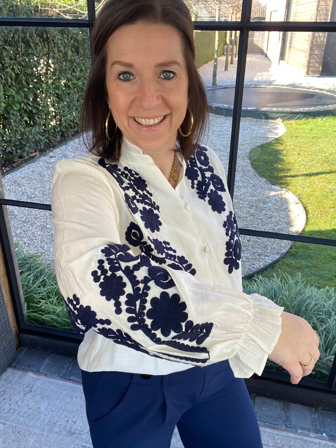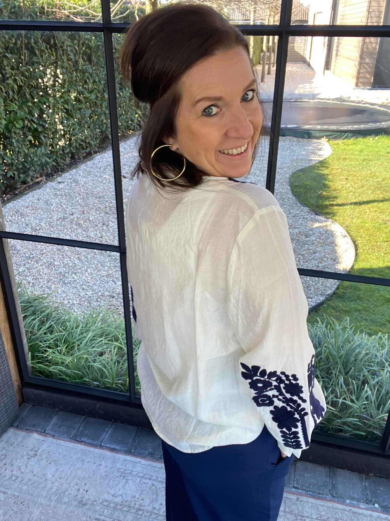 Prachtige ecru blouse met broderie op voorkant en mouwen