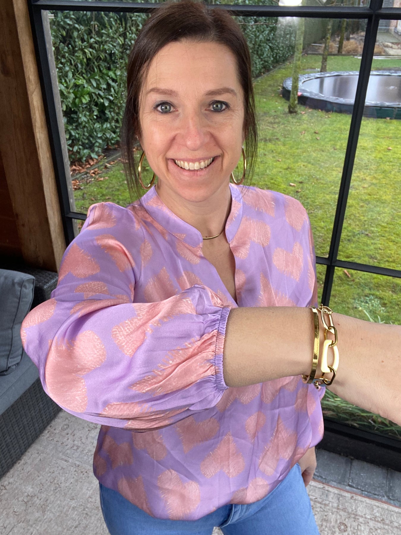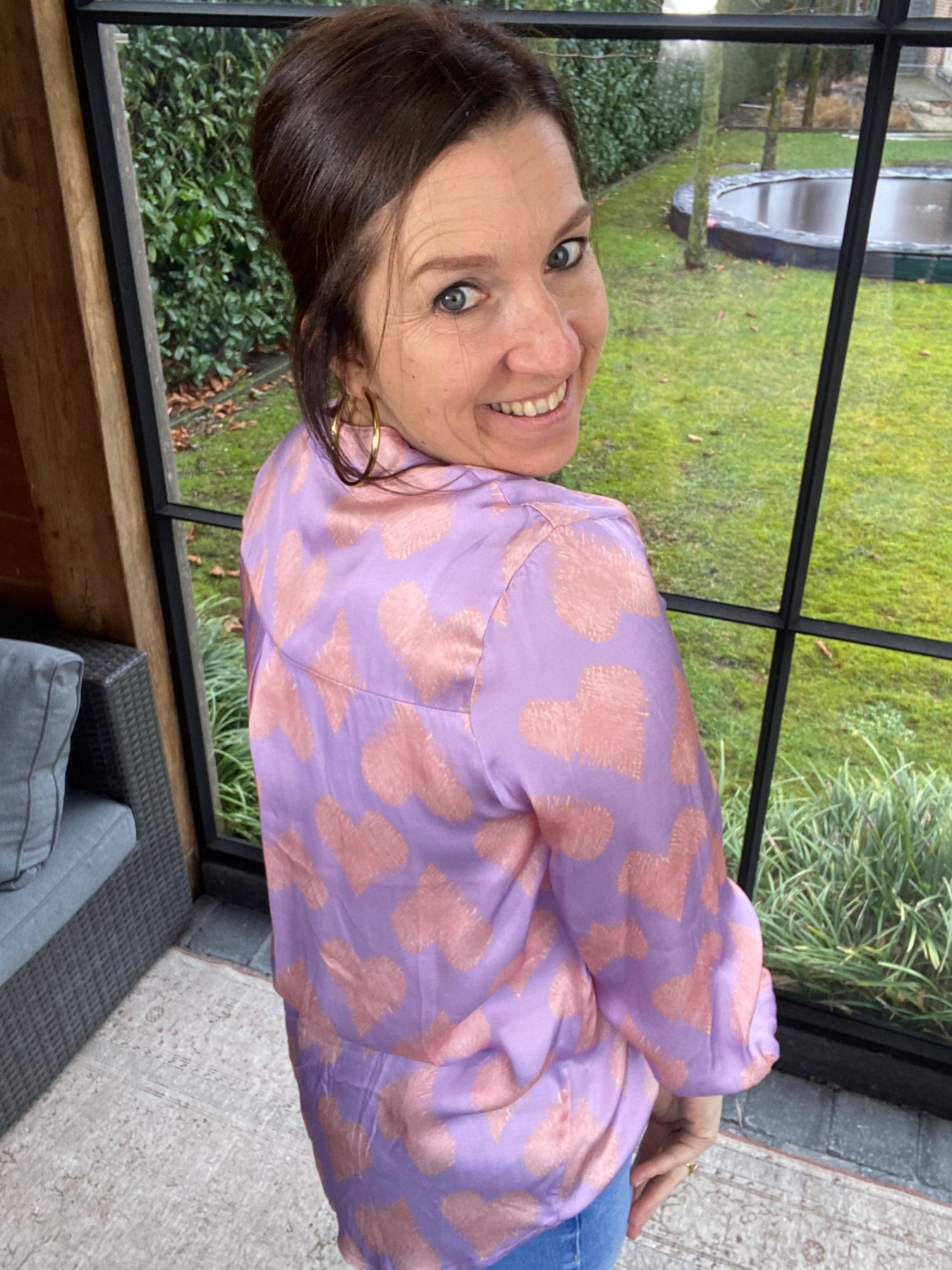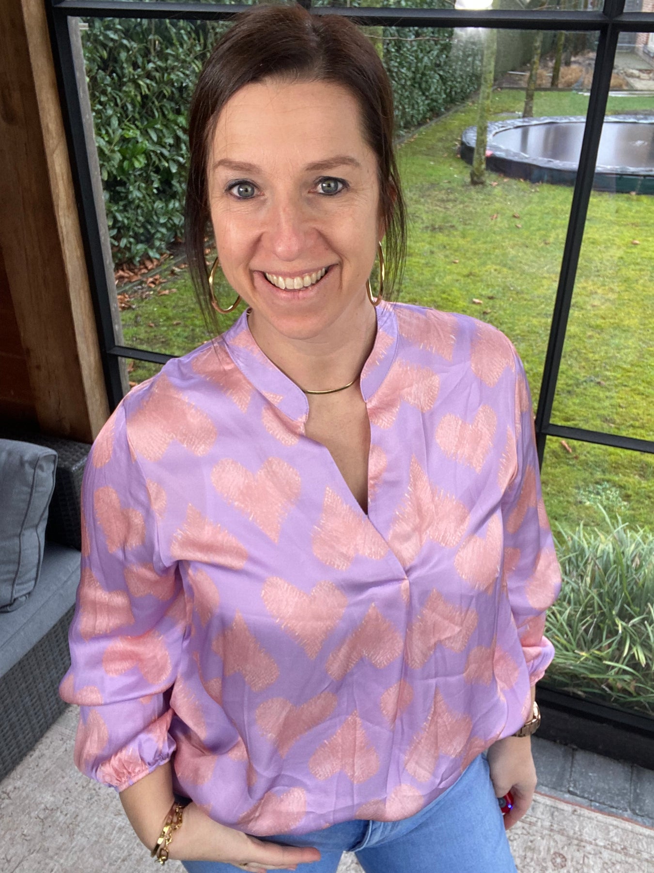 Algemene prijs 48,00Prachtige lila blouse met V-hals en roze hartjes motief