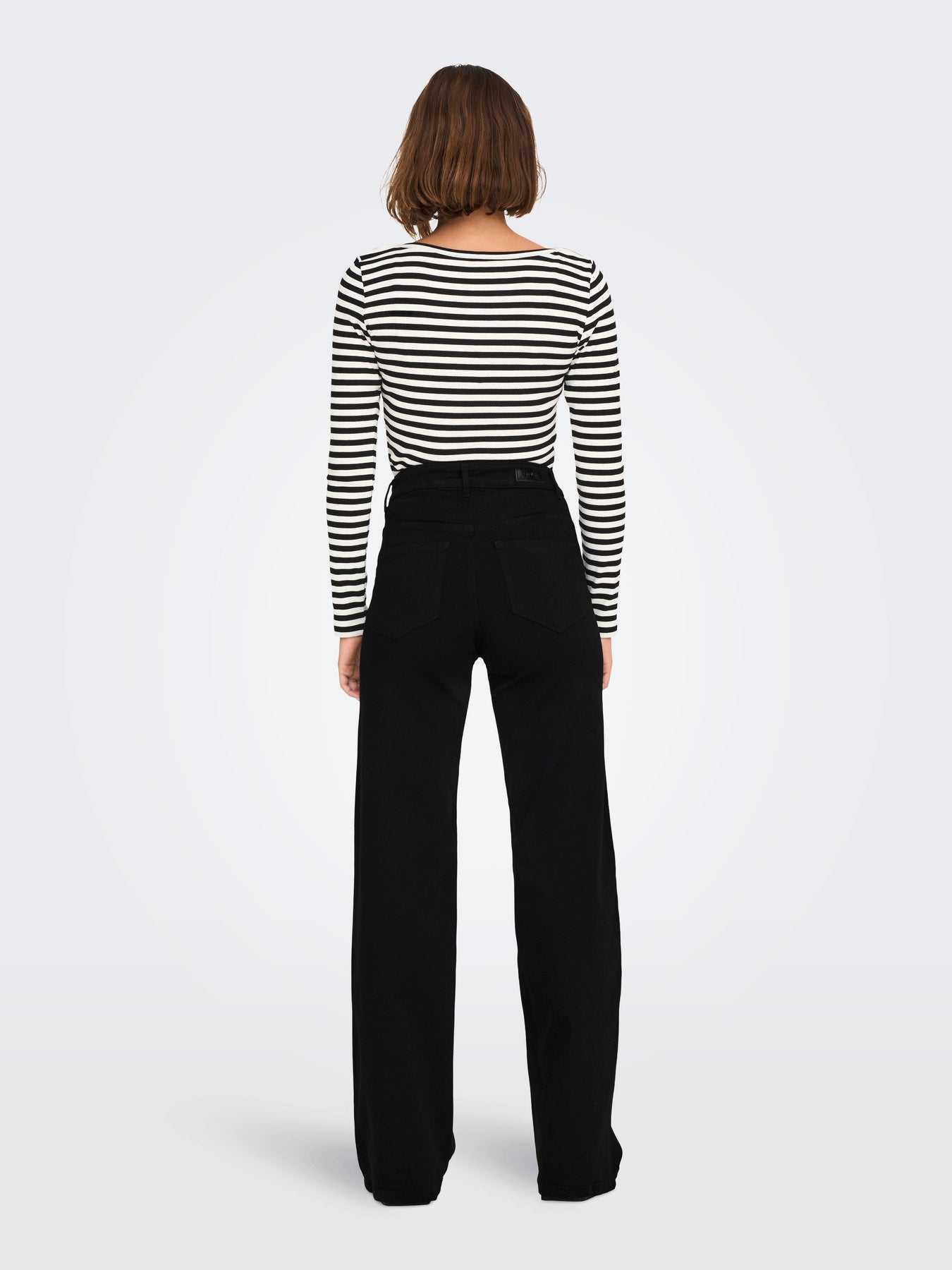Super toffe zwarte jeans van Only, model met wijde pijpen. Jeans is een los model met brede pijpen. Broek heeft zakken voor en achterkant met knop en rits.