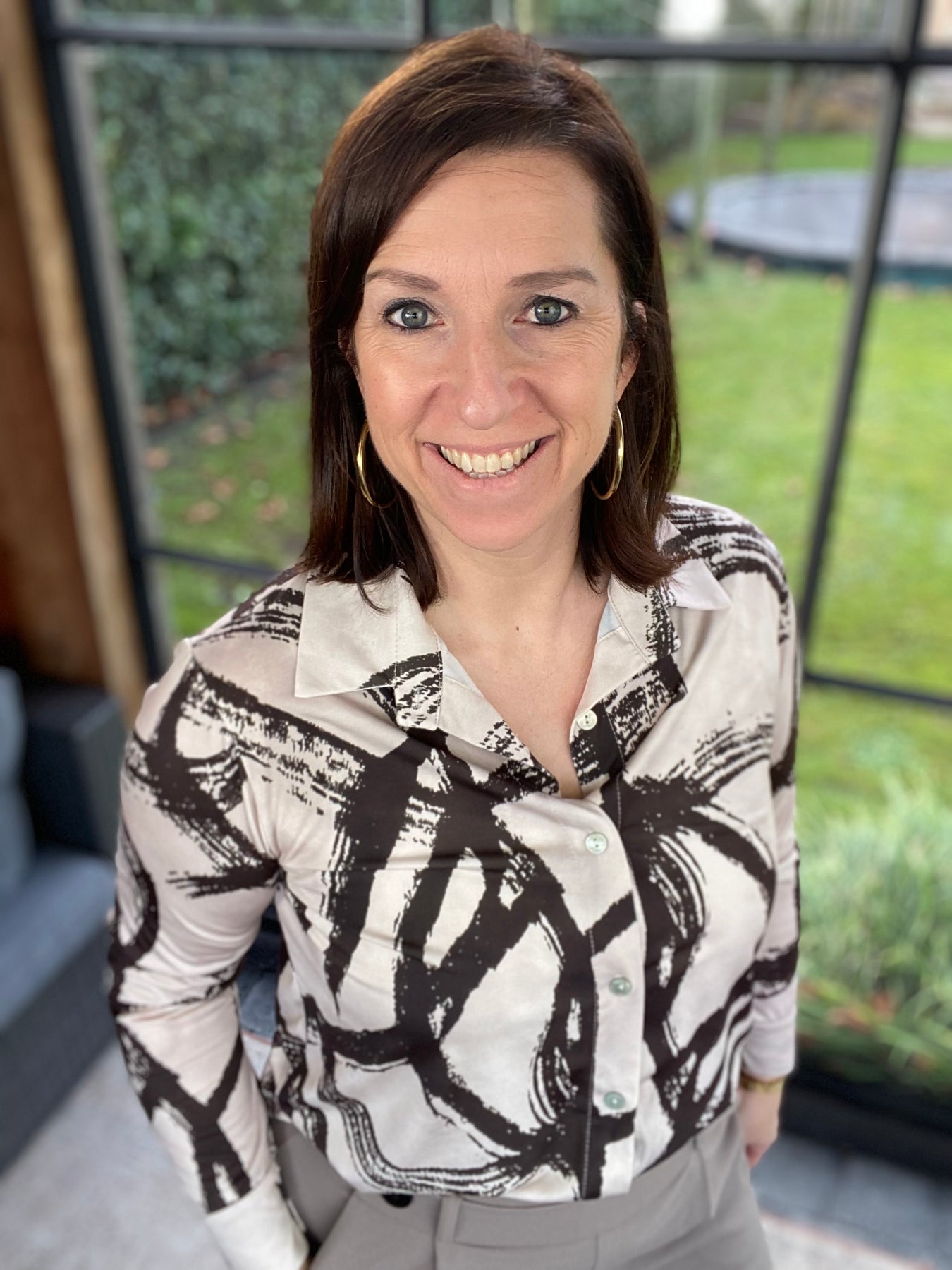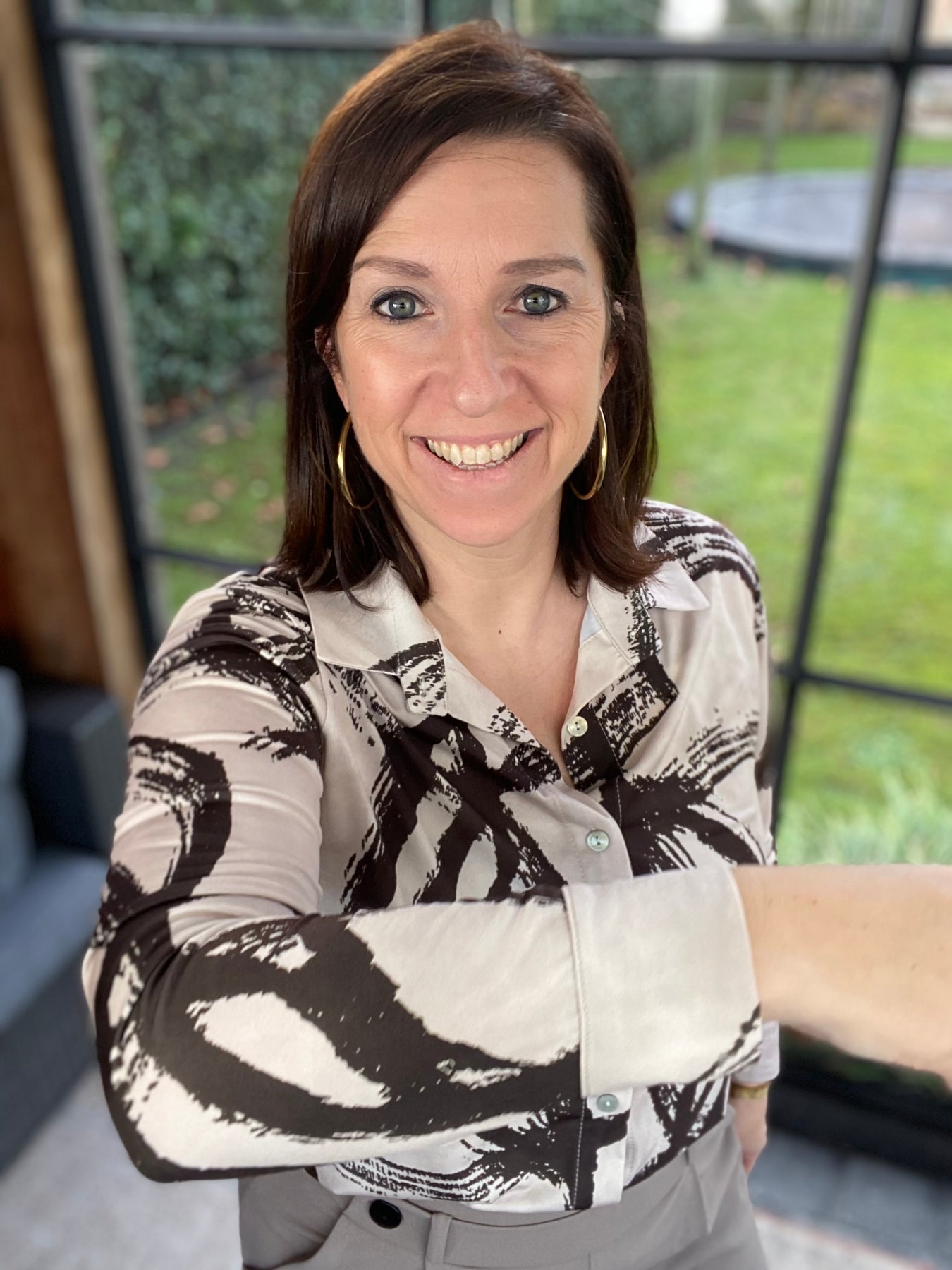 Algemene prijs 38,00Mooie blouse in met ecru bruine print