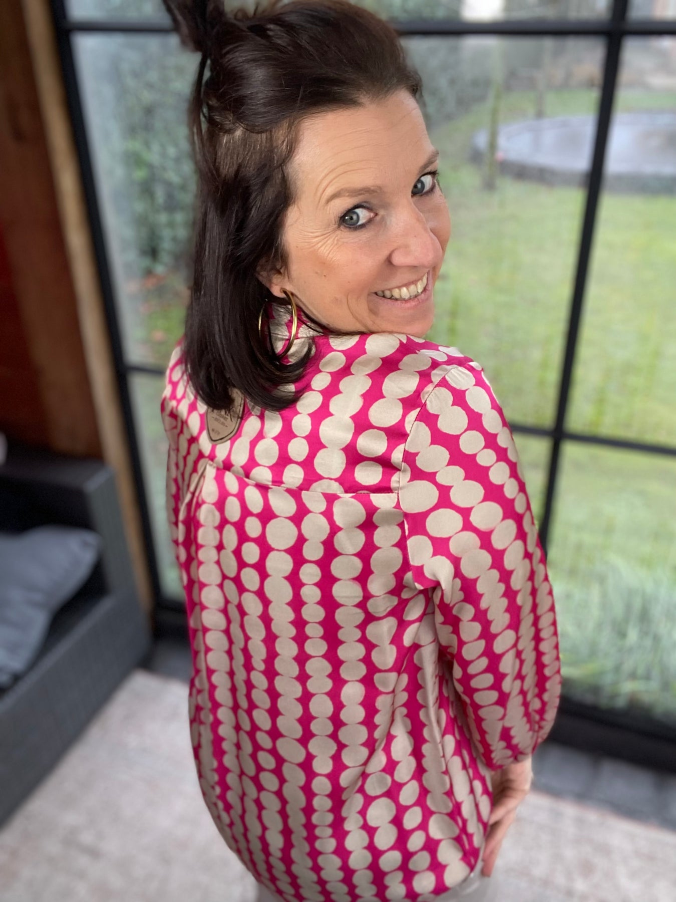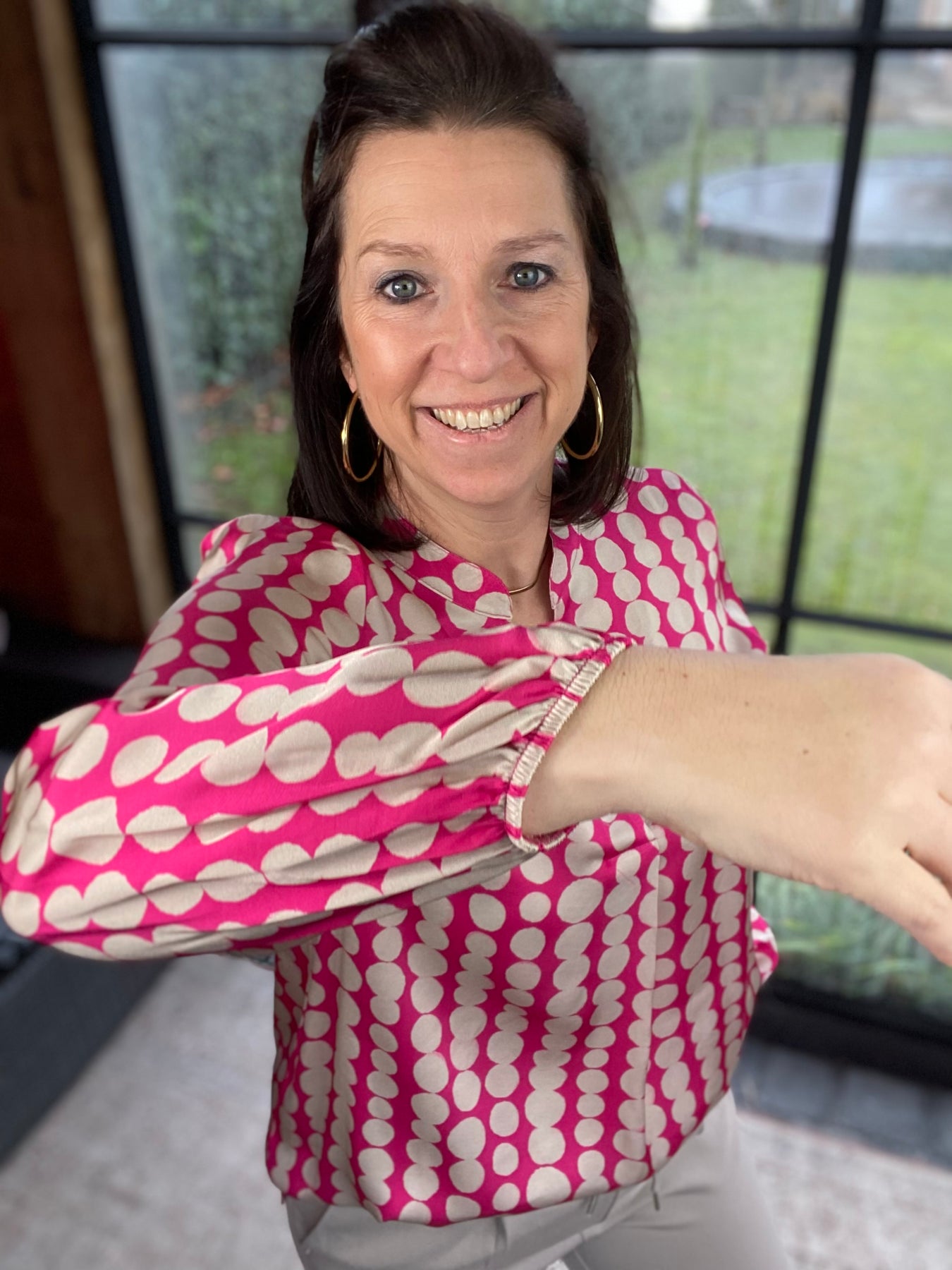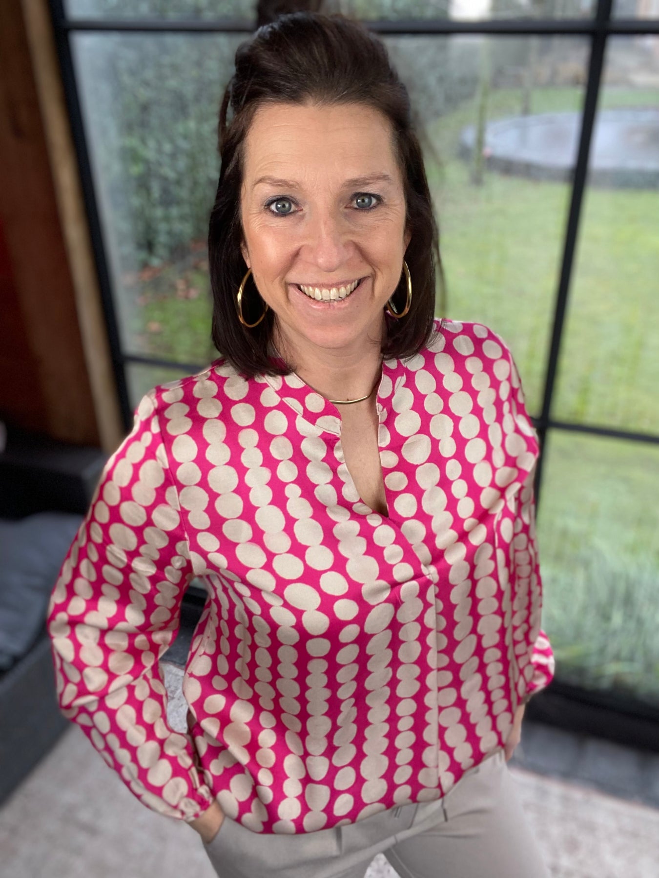 Prachtige Fuchsia blouse met V-hals en zwarte "dots" motief