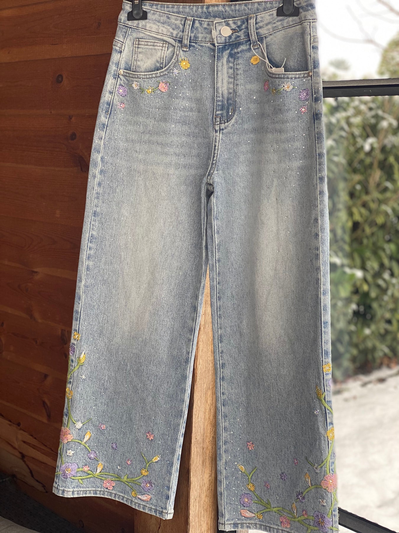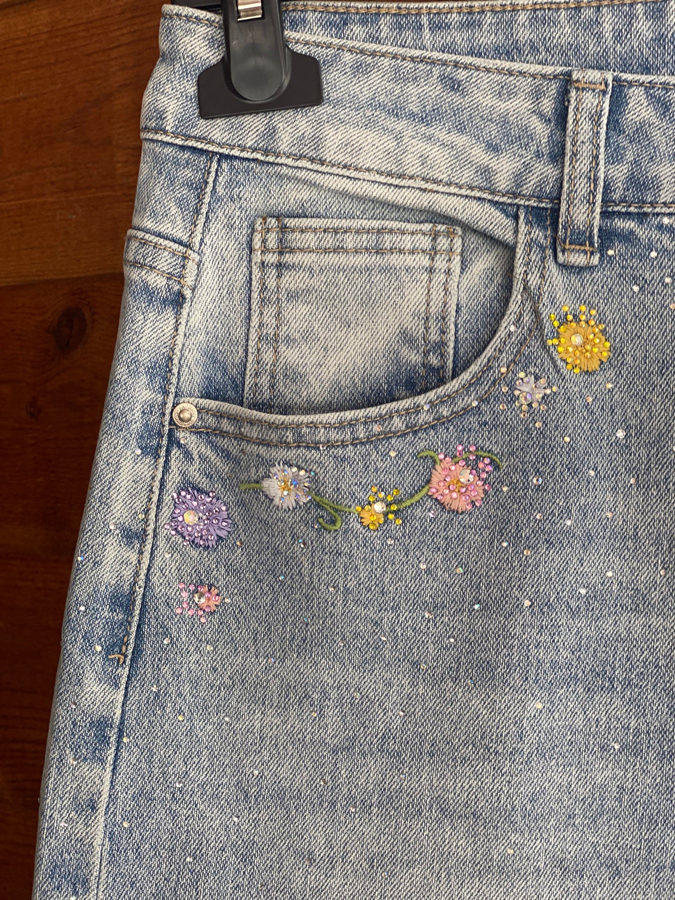 Super toffe jeansbroek met bloem en glitteraccenten