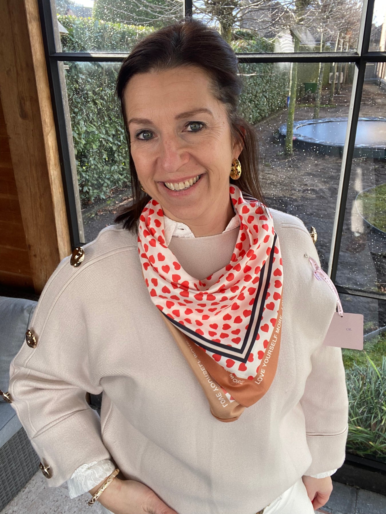 Algemene prijs 12,00Mooi dun sjaaltje met oranjekleurige hartjes