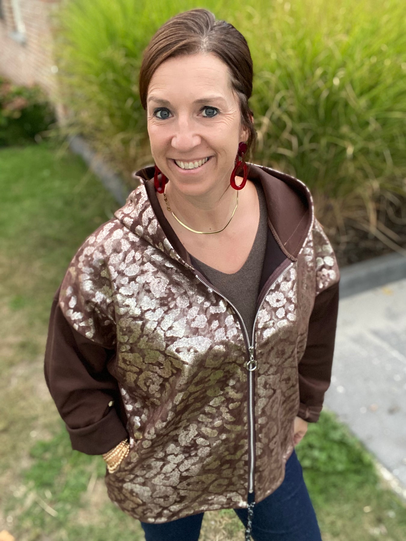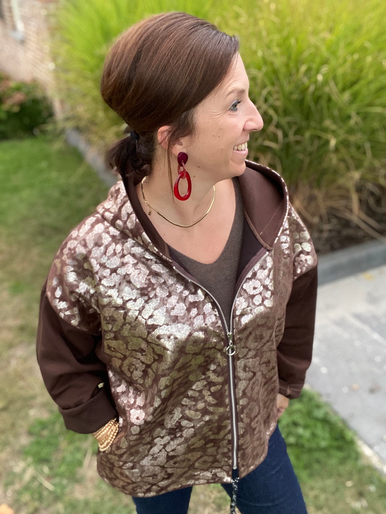 Algemene prijs 65,00Prachtig bruin vest jasje met blinkend leopard motief