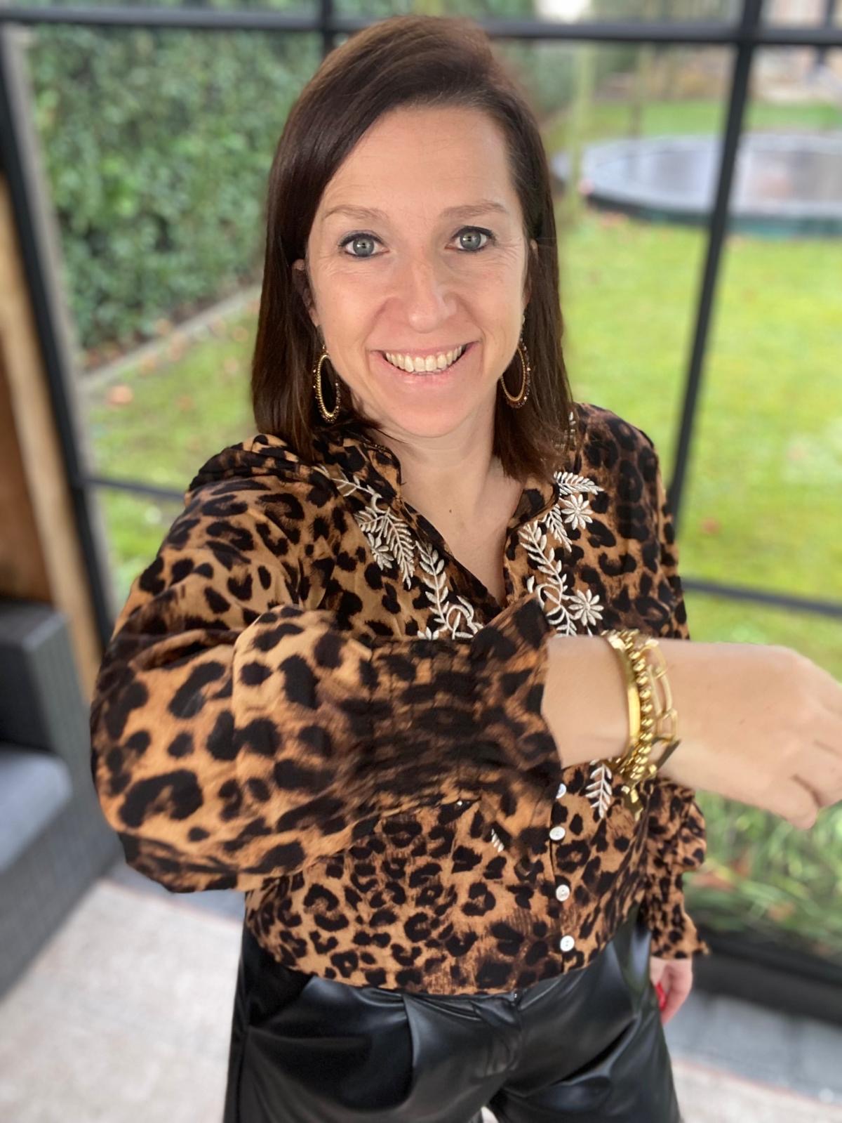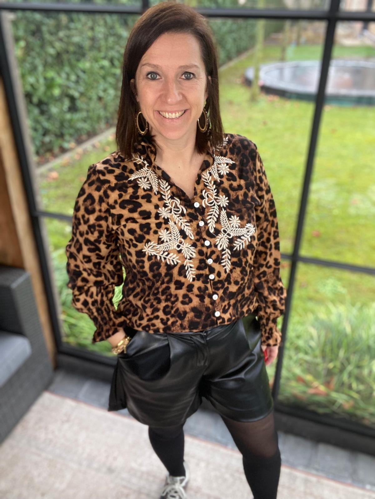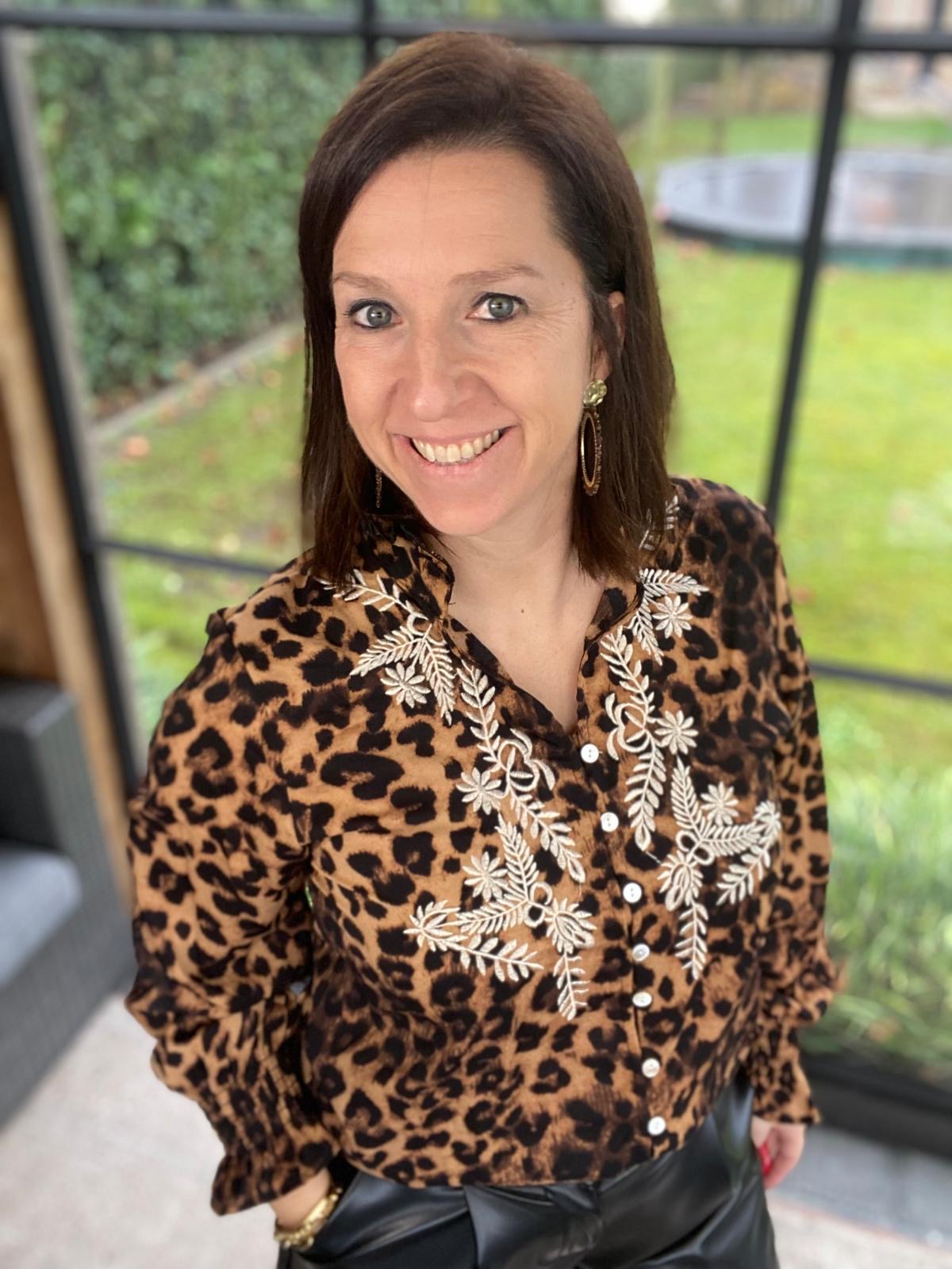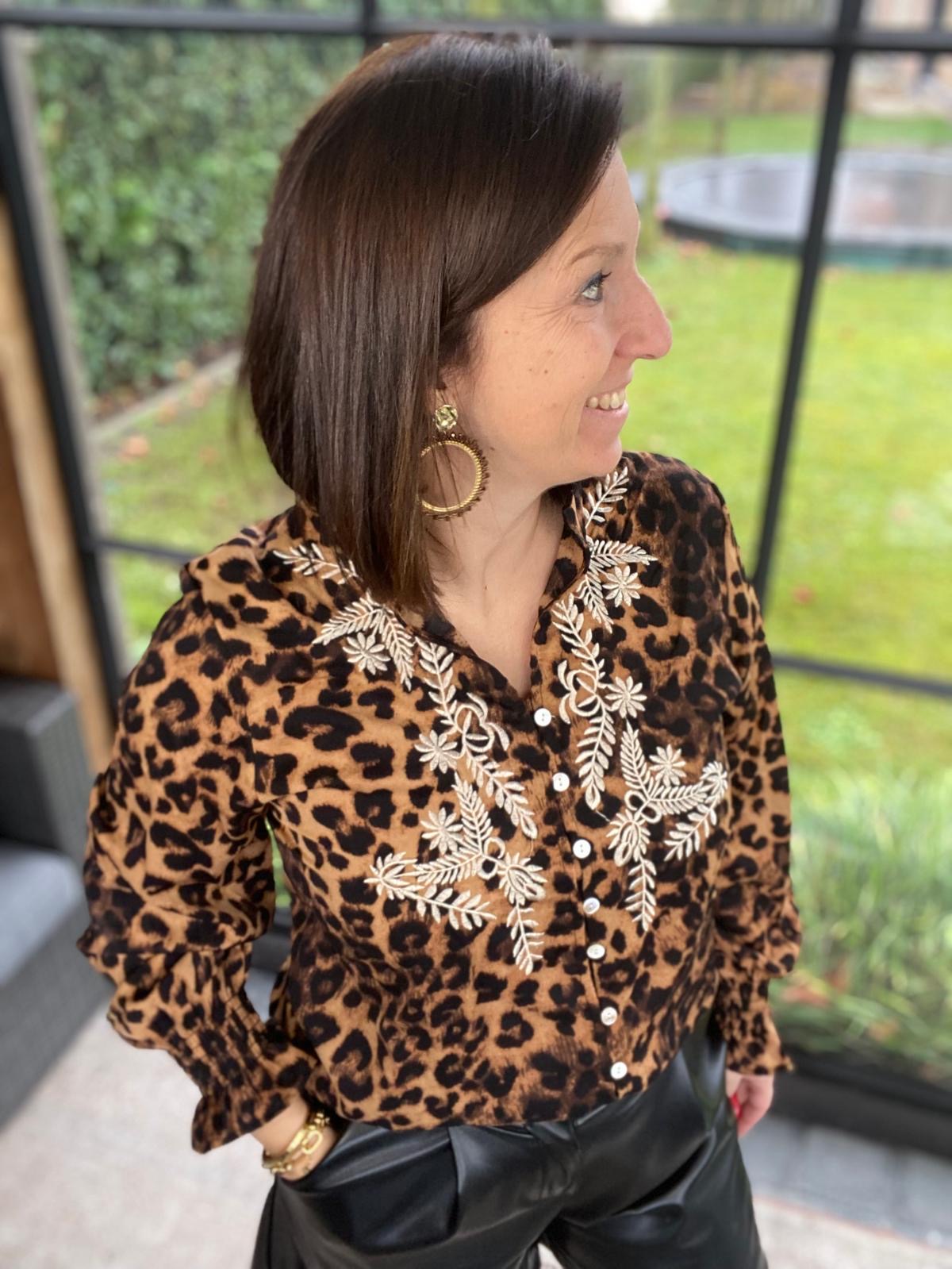 Mooie blouse met leopard motief en ecru broderie